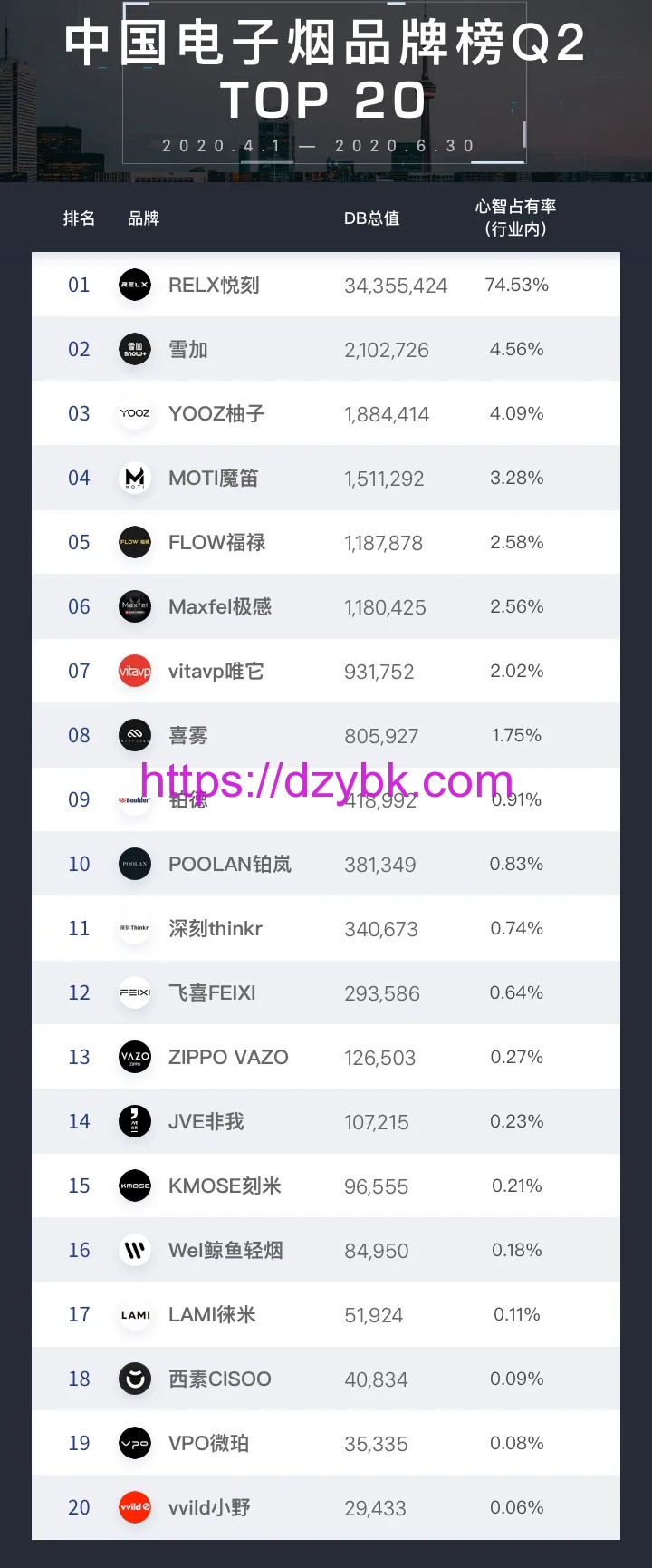 蓝洞新消费报道,7月20日消息,电子雾化新媒体蓝洞新消费(BlueHole)与品牌口碑大数据研究机构数字品牌榜(DBRank)今日联合发布了第二季度中国电子烟品牌心智占有率排行榜,本项榜单为2020年第二季度榜单。